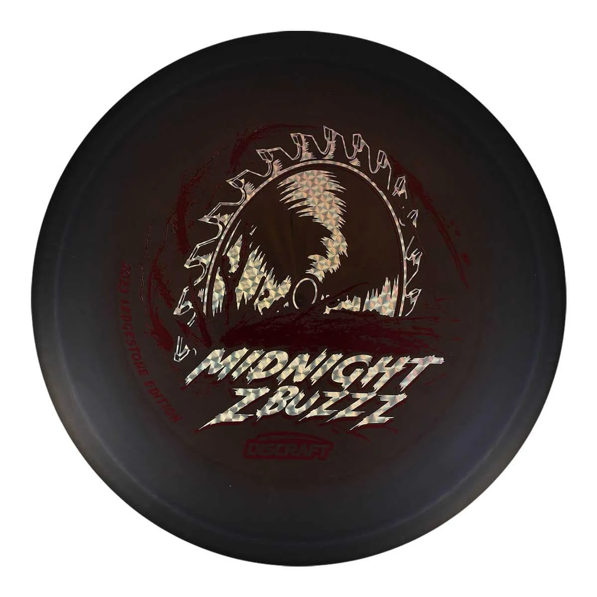 The highlight of these is the horror-themed stamp designed by famed disc golf artist Brian Allen. A 3-D cylindrical saw blade slices through the center of the disc while splatter from the carnage flies in every direction. The splatter and blade are stamped with two distinct color foils to make the design pop. This was part of a run of 1500 discs.